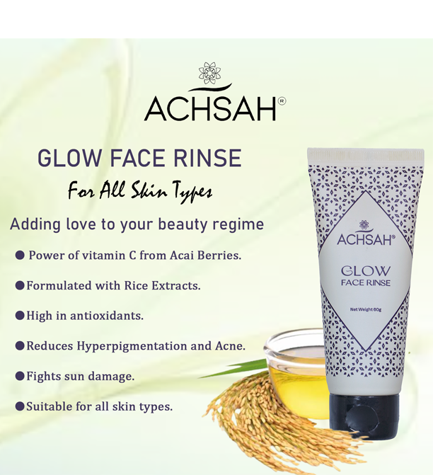 Packed with the power of vitamin C from acai berries and formulated with rice extracts , this powerful combination is high in antioxidants thereby reducing hyper-pigmentation and fighting acne. The Glow face rinse promises to reduce sun damage and promote healthy clean skin every time.